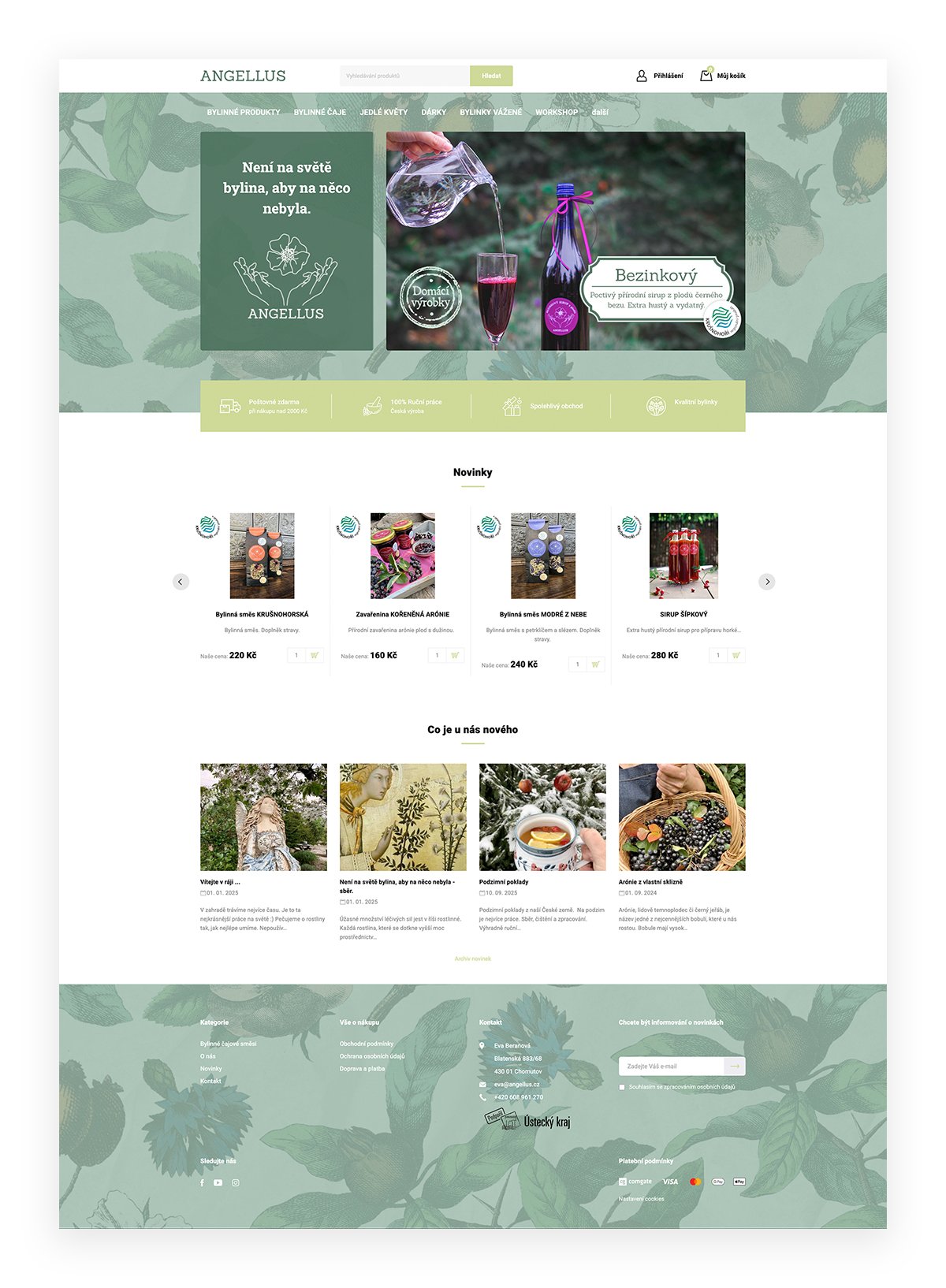 Internetový obchod Angellus.cz nabízí ručně vyráběné bylinné čajové směsi a další přírodní produkty bez chemických přísad, připravované s důrazem na kvalitu a respekt k přírodě. Tento e-shop jsme pro klienta kompletně navrhli a vytvořili, aby co nejlépe vystihl jedinečnost značky a její příběh.