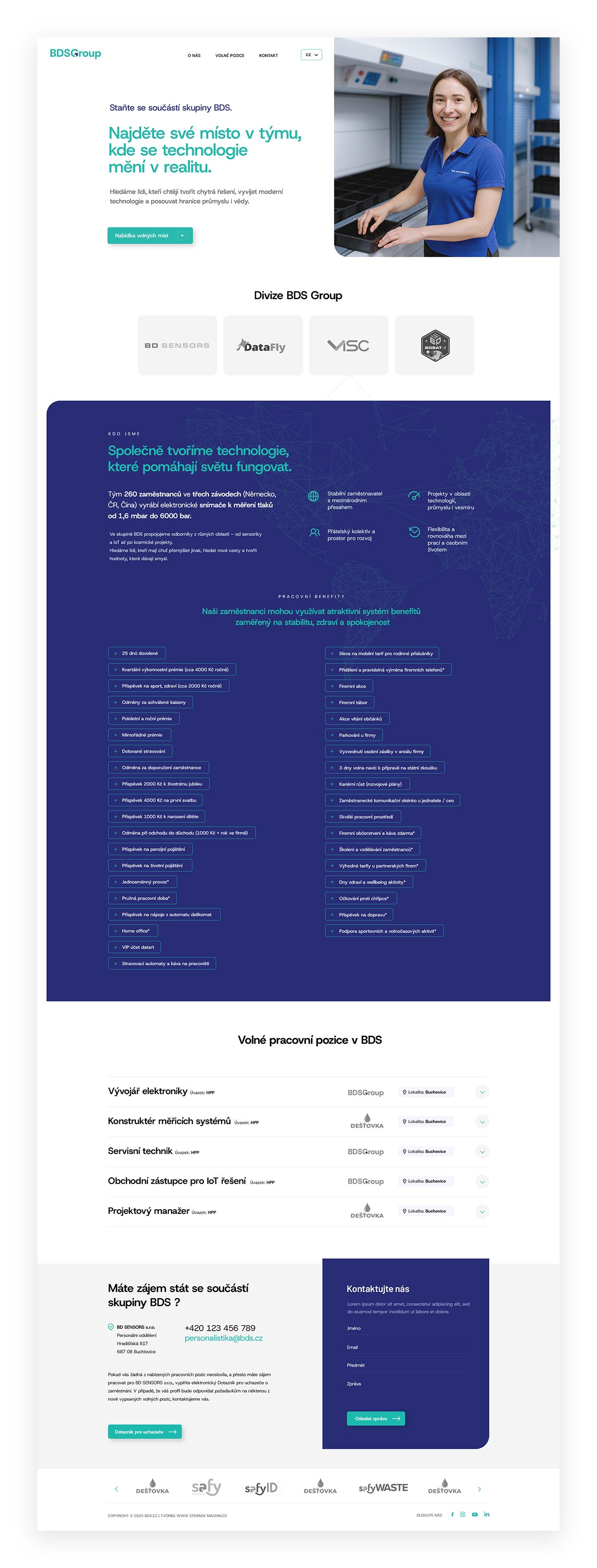 Web jsmebds.cz jsme spustili jako moderní kariérní platformu skupiny BDS, která přehledně představuje pracovní příležitosti, benefity i firemní kulturu. Cílem bylo vytvořit atraktivní a srozumitelný náborový web, který osloví nové talenty a ukáže technologické zaměření i hodnoty celé skupiny.