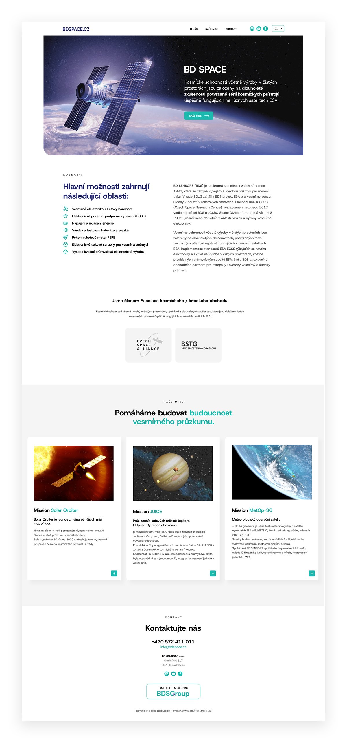 Web BD Space představuje moderní prezentaci společnosti zaměřené na vývoj vesmírné elektroniky, technologií a řešení pro kosmický průmysl, včetně projektů realizovaných pro ESA. Tento web jsme pro klienta navrhli a vytvořili tak, aby přehledně komunikoval jejich technologické know-how, reference i ambice v oblasti kosmického výzkumu.